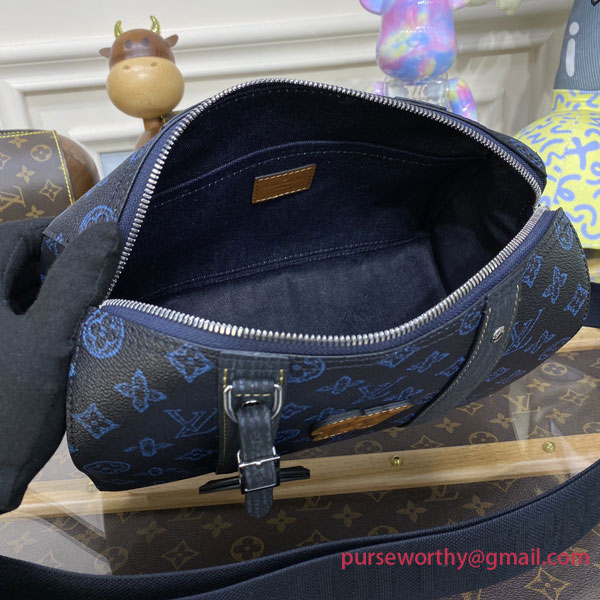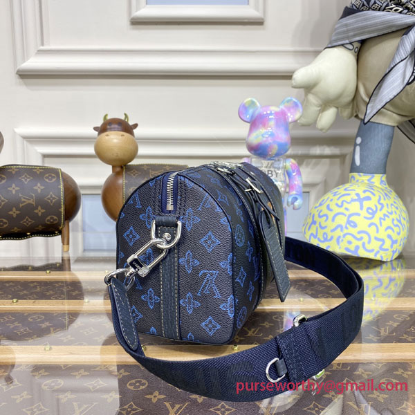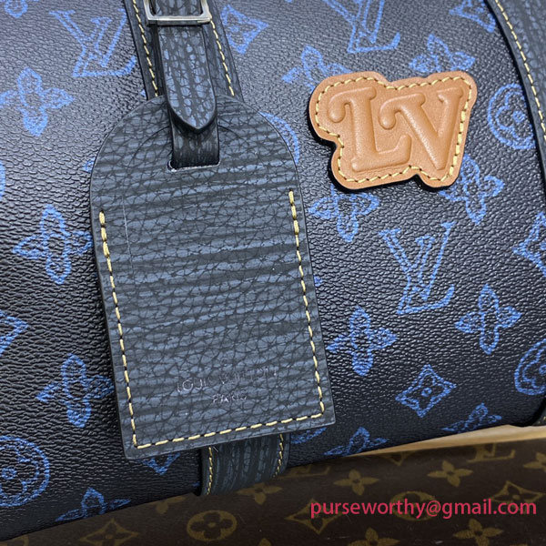 Made from blue Monogram canvas, the City Keepall, Virgil Abloh’s homage to the House’s iconic travel bag, takes on a retro aspect. The black-leather trim, and tan-leather LV initials stitched on the front of the bag, add a stylish feel. The removable and adjustable strap allow shoulder carry.