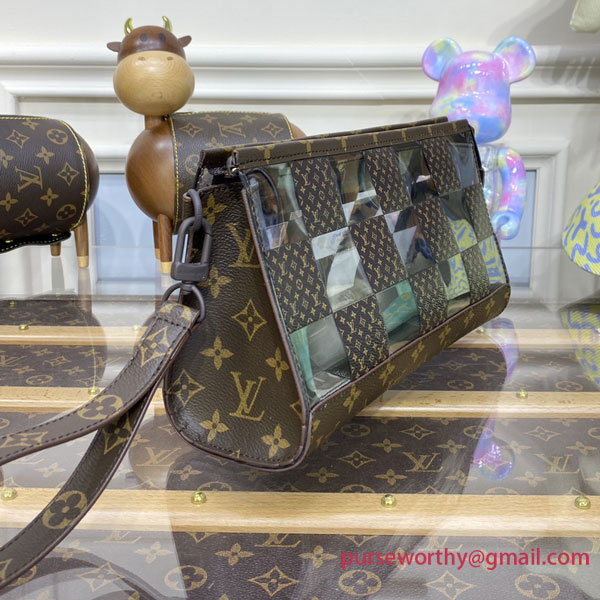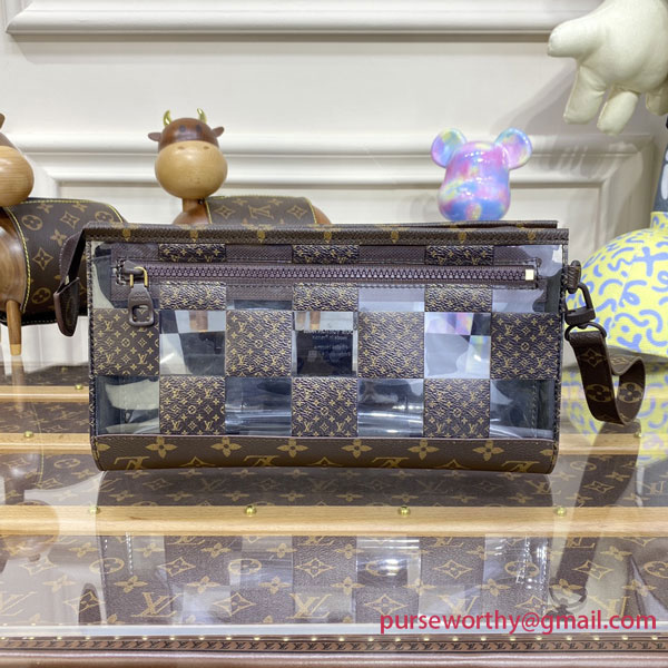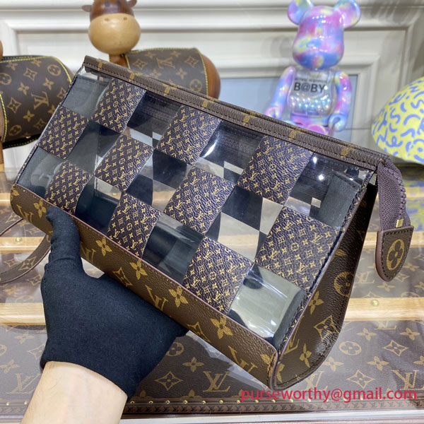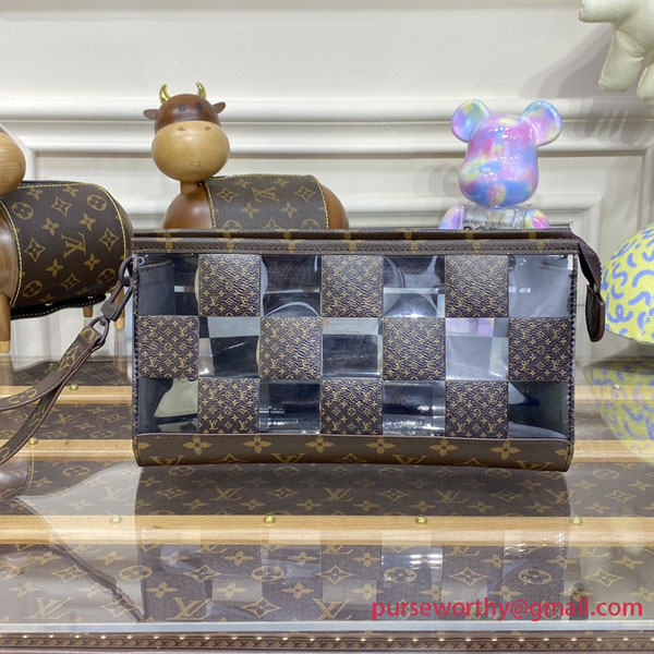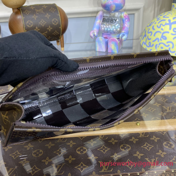 With its innovative design inspired by the triangular Sac Tricot bag from 1934, the Standing Pouch is an on-trend, original way to carry everyday personal necessities. This Monogram Chess version offers a fun contemporary take on two of Louis Vuitton’s most iconic patterns: the Damier squares and the classic Monogram motif, combined with crystal-clear PVC.