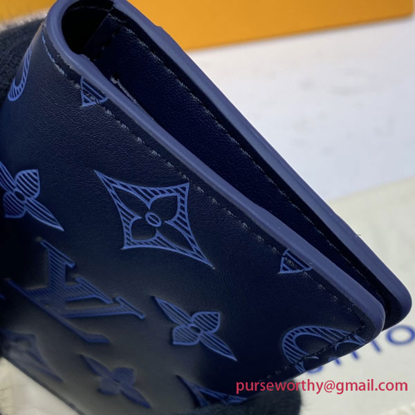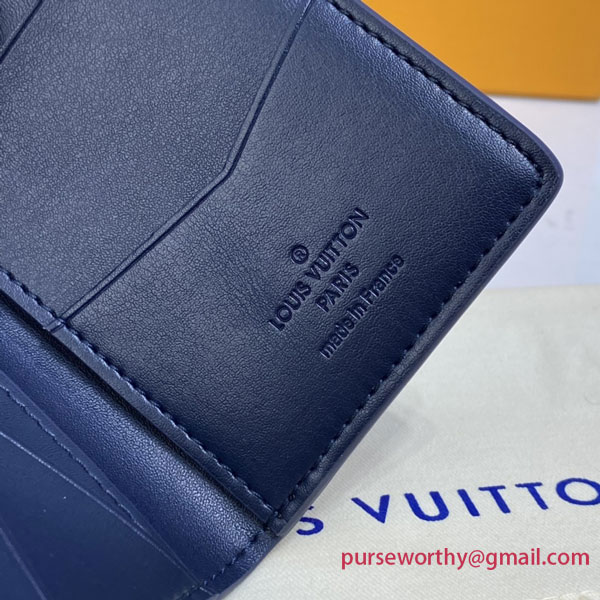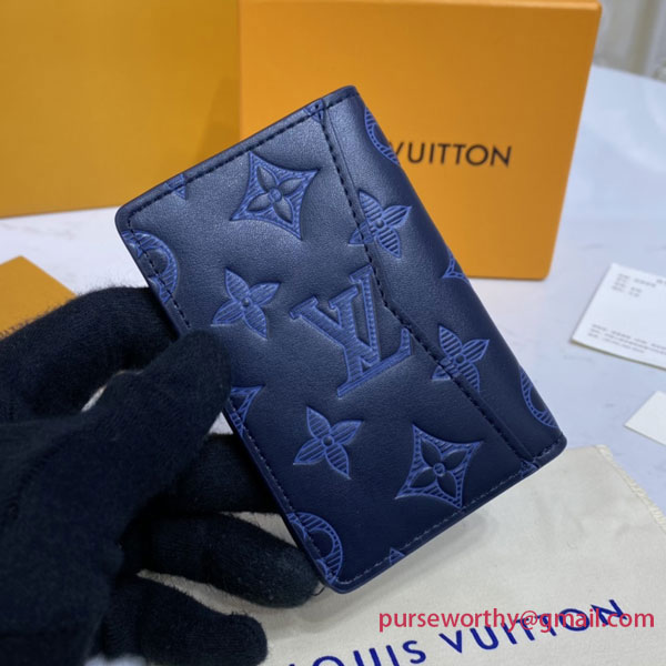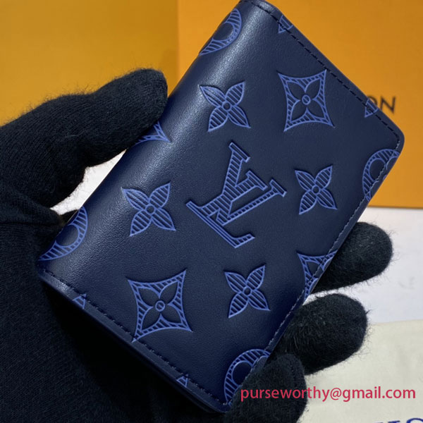 The Pocket Organizer wallet is made from navy blue Monogram Shadow leather. The Monogram pattern in light blue, embossed and printed on the supple leather, brings a subtle touch of color. An alternative to the conventional wallet, it has pockets and card slots to keep things organized.