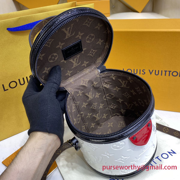 This fashionable Cannes handbag is made from white patent calfskin leather with a shiny red leather patch at the top, and Monogram canvas on the top handle and thin shoulder strap. This on-point piece can be carried in a variety of ways, thanks to its top handle and adjustable strap.
