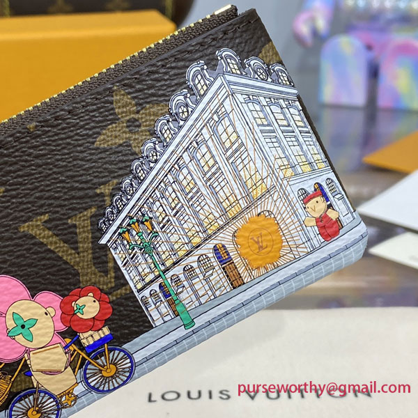 This exclusive edition of the Key Pouch in Monogram canvas is part of the Vivienne Holidays 2022 collection, which celebrates the spirit of travel. A colorful, detailed print features Louis Vuitton's mascot Vivienne in front of the Paris boutique on Place Vendôme. This collectible accessory, which can also carry cash and cards, makes an ideal gift.