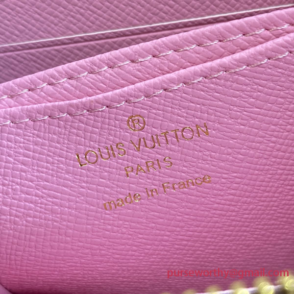 For the Holiday 2022 collection, the emblematic Zippy coin purse in Damier Ebene canvas is revisited with an exclusive print evoking Louis Vuitton's travel heritage. It features the House's Vivienne mascot cycling past the Paris boutique on Place Vendôme, with the historic Vendôme column in the background. This compact, zip-around purse opens to reveal a pink leather lining.
