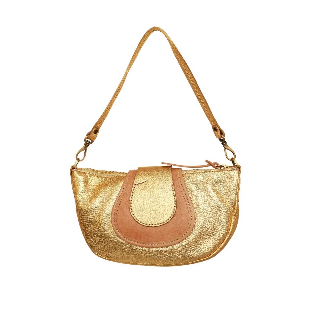 Hogan Gold Leather Beige Det. Shoulder Strap Handbag Zipper top Bag