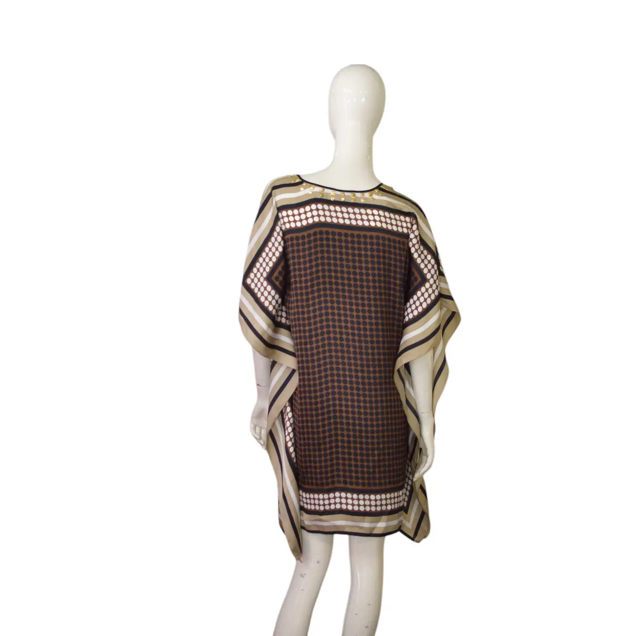 Extra comfortable caftan dress in earthly hues and geometric pattern with beautiful gold stud details and V- neckline by Michael Kors for the summer look!