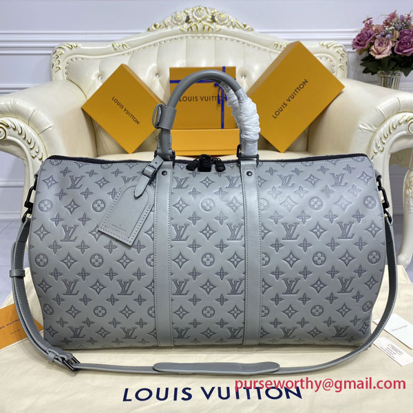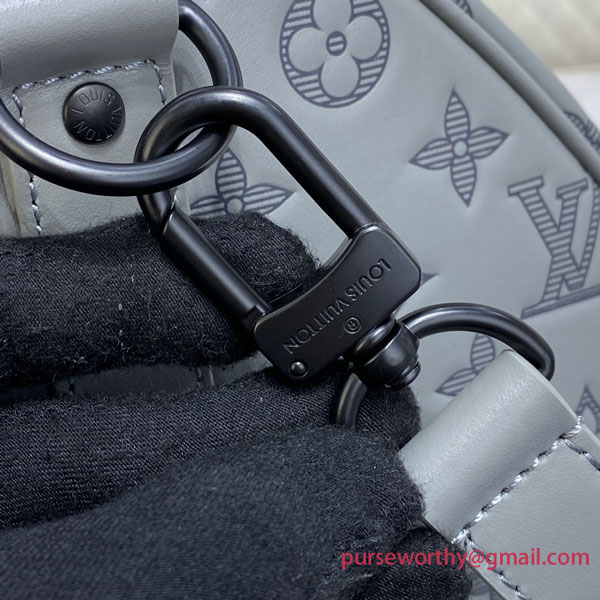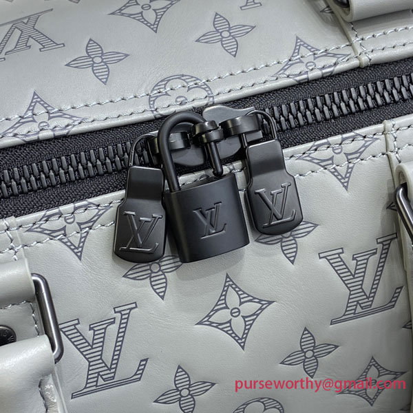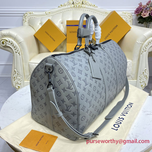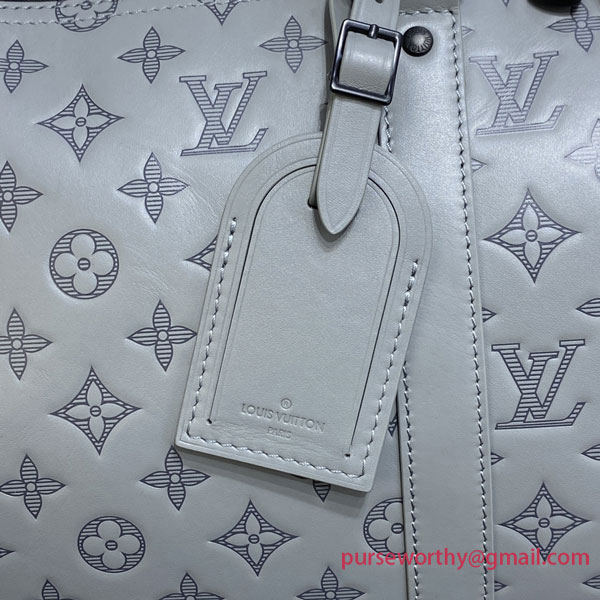Louis Vuitton’s classic Keepall gets a contemporary new look with Monogram Shadow leather in a sophisticated shade of gray. Soft, supple calf leather is embossed with the House’s historic Monogram pattern for a refined signature touch. A large-capacity bag, perfect for short trips or as a carry-on.