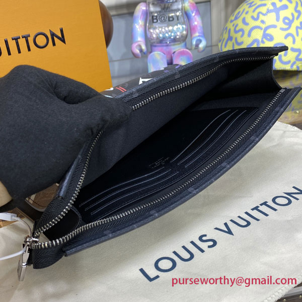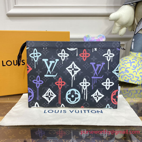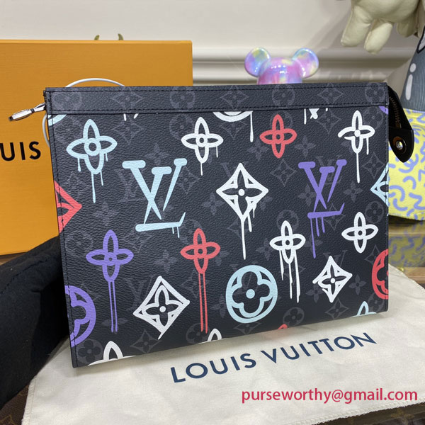 The Pochette Voyage takes on a streetwear feel in Monogram Eclipse canvas with a graffiti treatment of the Monogram pattern. An unexpected take on a useful accessory, this pouch is ideal for carrying small personal items. The Pochette Voyage slips easily into a larger bag.
