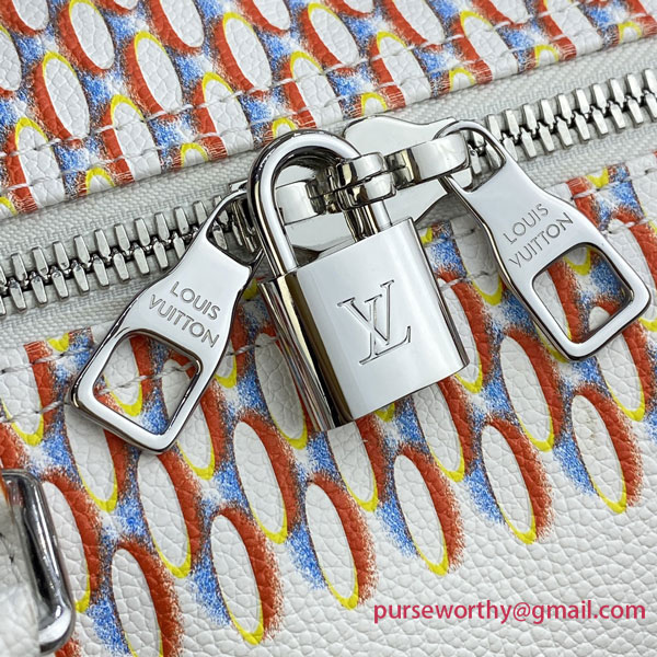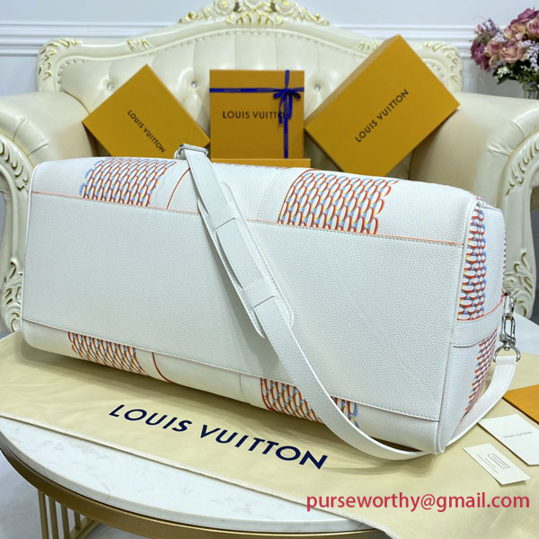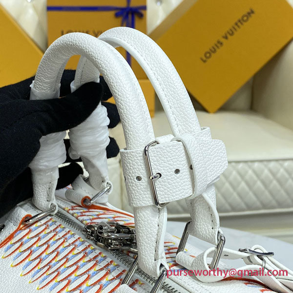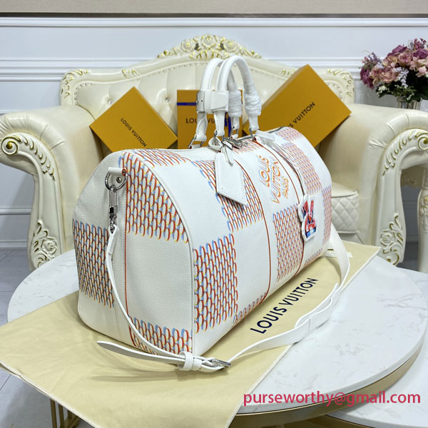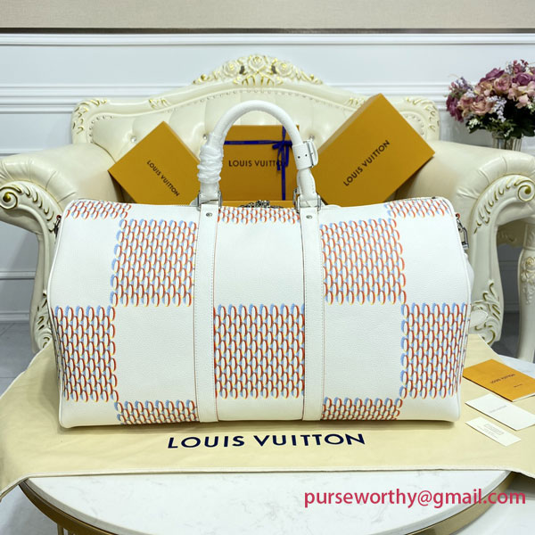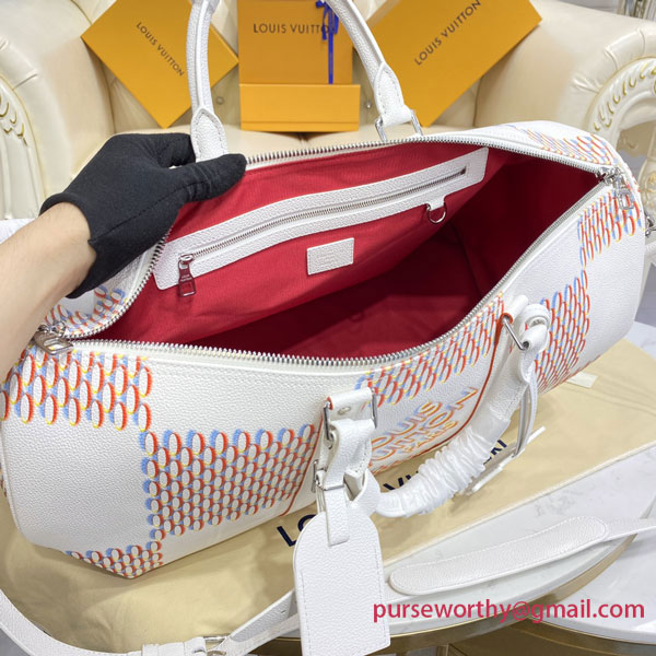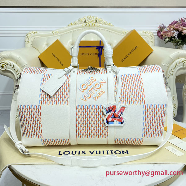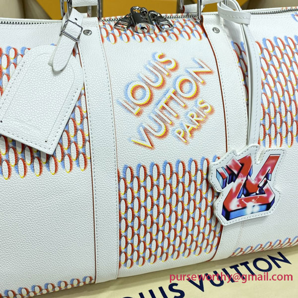 The classic Keepall gets a street-smart update with the Damier Spray decoration on white cowhide. Louis Vuitton’s historic checkerboard pattern is reinterpreted with a 3D sprayed effect, accented with an outsized “LV” signature tag in a graffiti art style. An on-trend bag that makes a stylish statement – ideal for modern-day Damier fans.