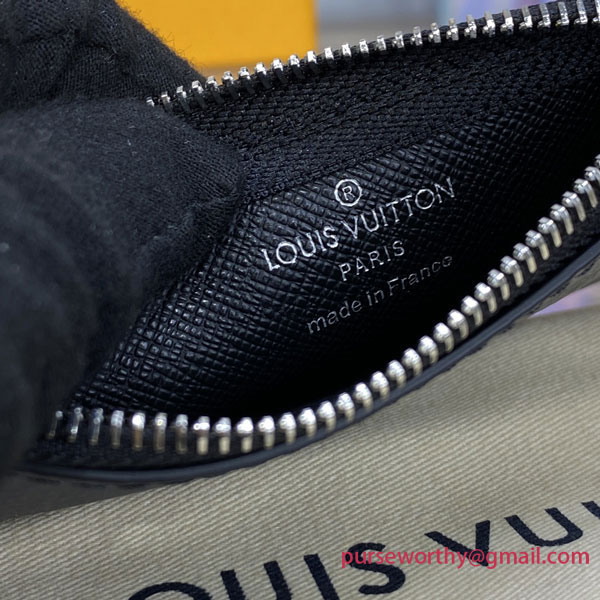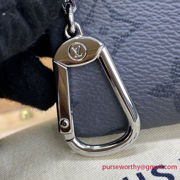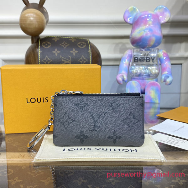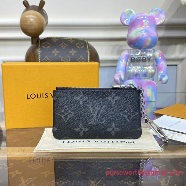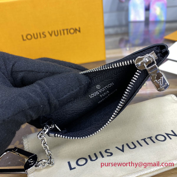 This Key Pouch is made from Monogram Eclipse canvas on one side with lighter Monogram Eclipse Reverse on the other. It’s ideal for carrying coins, cards, banknotes and other small items, as well as keys. Secured with an LV-engraved zip pull, it features a chain and hook to clip it to a bag or belt.