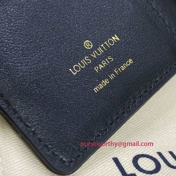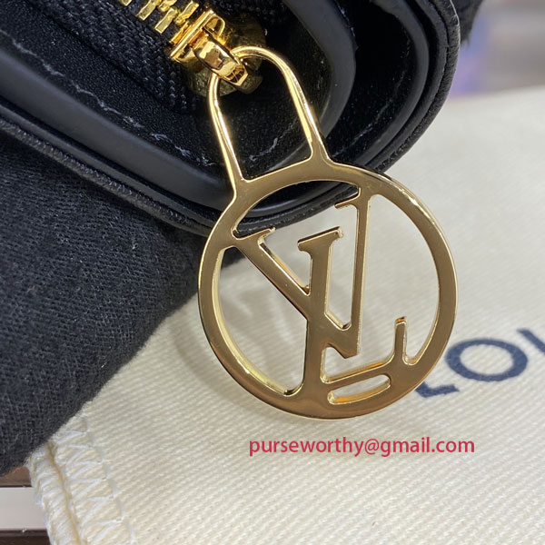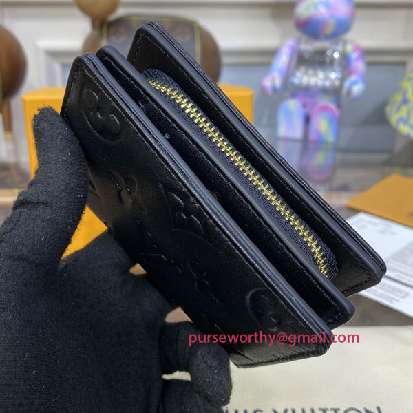 The Lou Coussin wallet comes in soft lambskin, which is embossed with Louis Vuitton's iconic Monogram pattern to create a puffy effect. This small, square wallet is notable for its space-efficient design. It opens to reveal a practical interior with six card slots and a bill compartment, as well as a zipped coin pocket on the side.