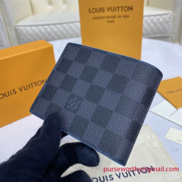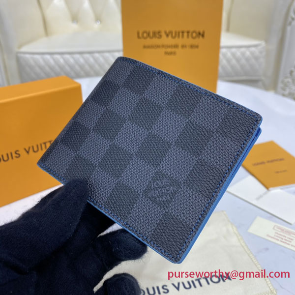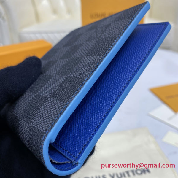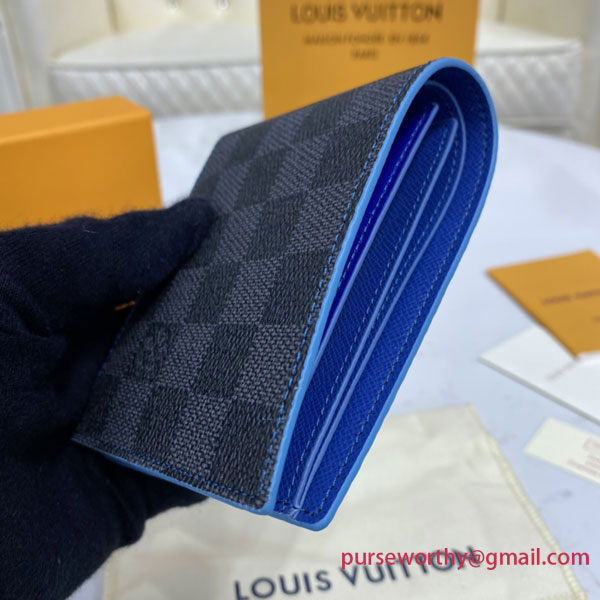 Crafted from Damier Graphite canvas, Louis Vuitton's Slender wallet opens to reveal a lining in electric-blue cowhide leather, which contrasts with its black and gray exterior. True to its name, this slim-line wallet holds payment essentials in a format that slips easily into a jacket or trouser pocket.
