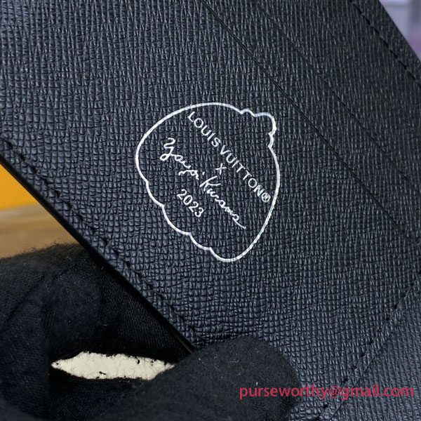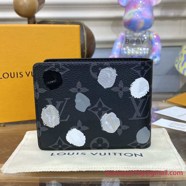 The LVxYK Multiple wallet features an upbeat print on Monogram Eclipse canvas for the new Louis Vuitton x Yayoi Kusama collection. A forerunner of the avant-garde since the 1960s, the venerated Japanese artist is known for her emblematic use of dots. This pattern reproduces her hand-painted dots using a sophisticated screen-printing technique with a realistic 3D effect. A practical accessory becomes an artistic expression.