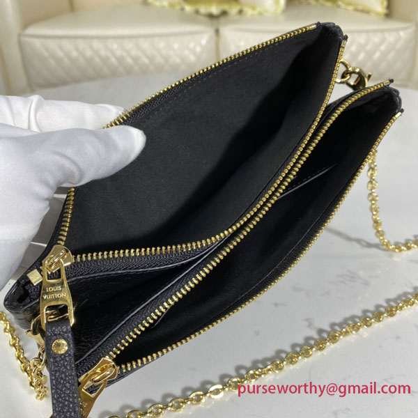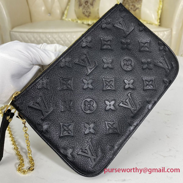 The Double Zip Pochette in two-tone Monogram Empreinte leather is a versatile pouch designed for busy lifestyles. Its two zipped pockets hold valuables, including smartphones, while its middle space allows direct access to essentials. The supple, embossed leather makes it pleasant to carry either on the shoulder or in the hand.