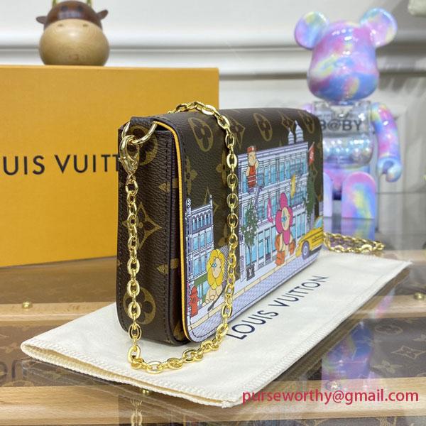 For Holiday 2022, Louis Vuitton celebrates the spirit of travel with this special edition of the Félicie Pochette in Monogram canvas. An exclusive print depicts the House's Vivienne mascot alongside the New York Soho boutique and an iconic yellow cab. This collectible version of this stylish, versatile pouch is finished with a matching textile lining.