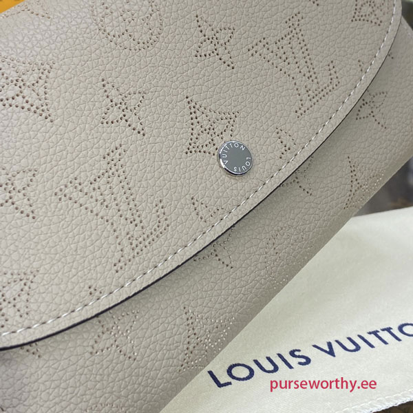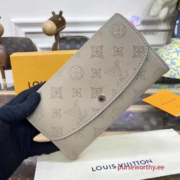The sophisticated Iris wallet is crafted from Mahina leather, an exceptionally supple calfskin with delicate Monogram-pattern perforations. Its feminine, rounded flap opens to reveal two roomy compartments, a zipped pocket for coins and numerous card slots. This wallet is notable for refined details, such as its engraved, silver-tone press-stud.