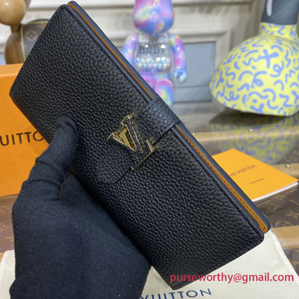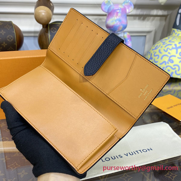 The LV Vertical wallet is an elegant design crafted from soft, grained Taurillon leather. It opens to reveal a contrasting lining, as well as eight card slots, a zipped coin pocket and a large, V-shaped slot for tickets and bills. This wallet features a distinctive sliding closure with an LV Initials accessory inspired by the iconic Capucines bag.