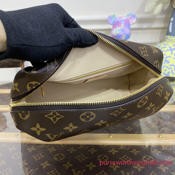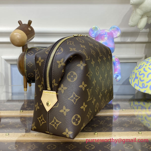 This Cosmetic Pouch is fashioned from timeless Monogram coated canvas, with gold-color hardware, and a washable lining. An inside flat pocket and inside zipped pocket keep toiletries organized. The pouch closes with a zipper.