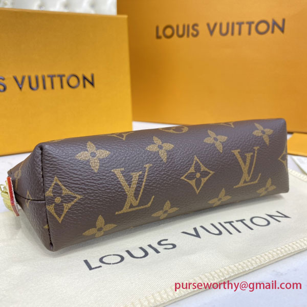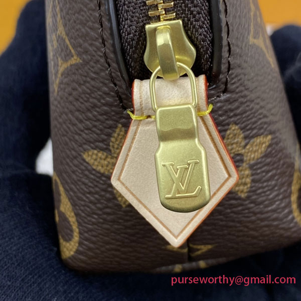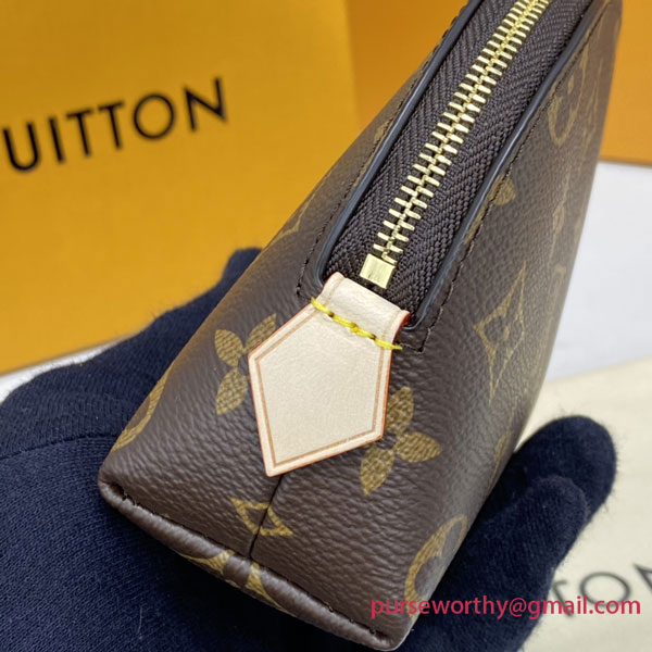 This compact cosmetic pouch in Monogram canvas slips easily into a handbag or suitcase. Its round shape and flat base facilitates access to small products.